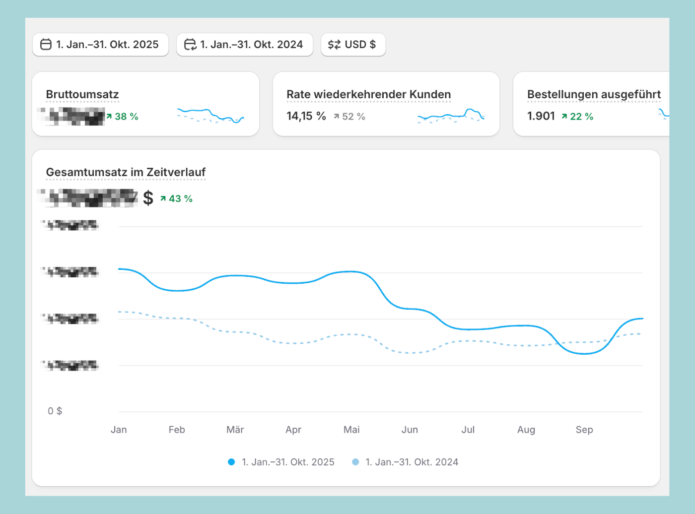 Durch präzises Creative-Testing, neue Zielgruppenansprachen und eine Performance-Strategie, die Design und Effizienz vereinte, konnten Umsatz, AOV und Wiederkaufrate deutlich gesteigert werden – bei geringerer Rabattquote und höherem Markenwert.